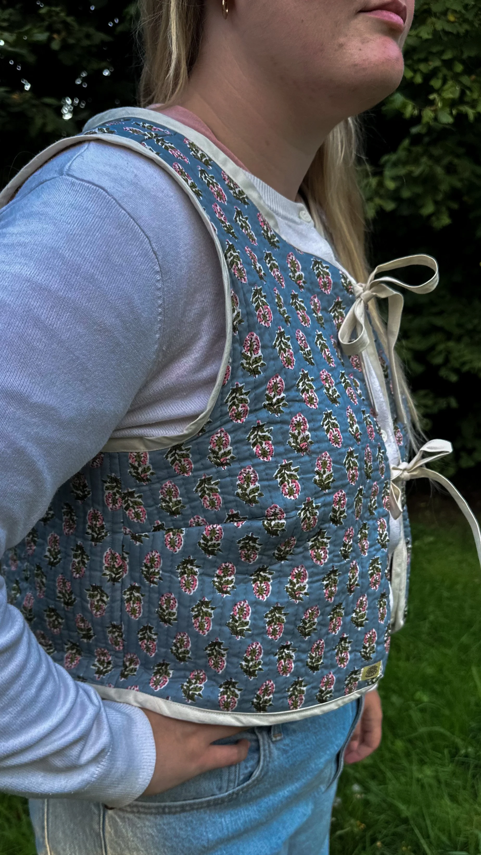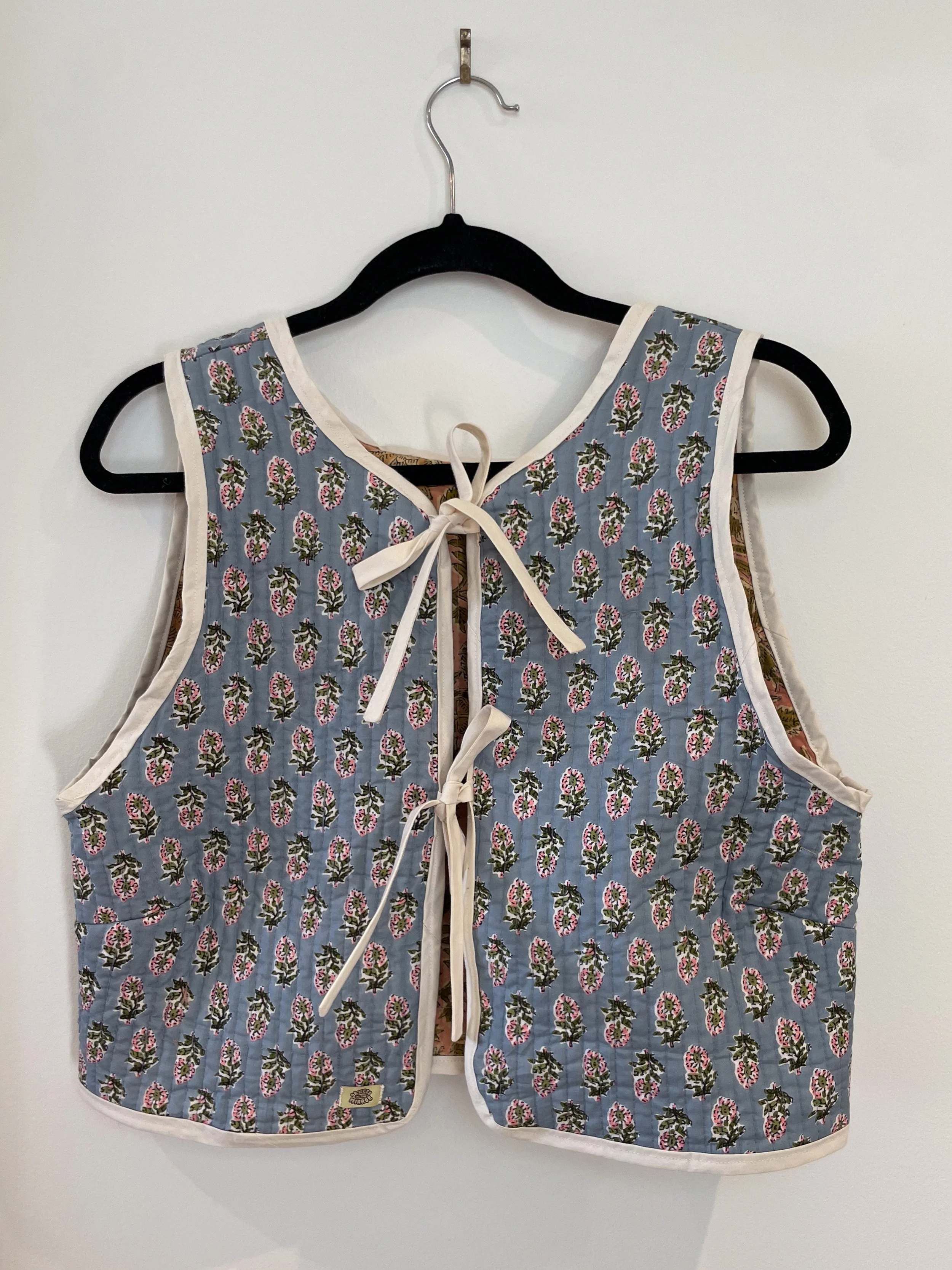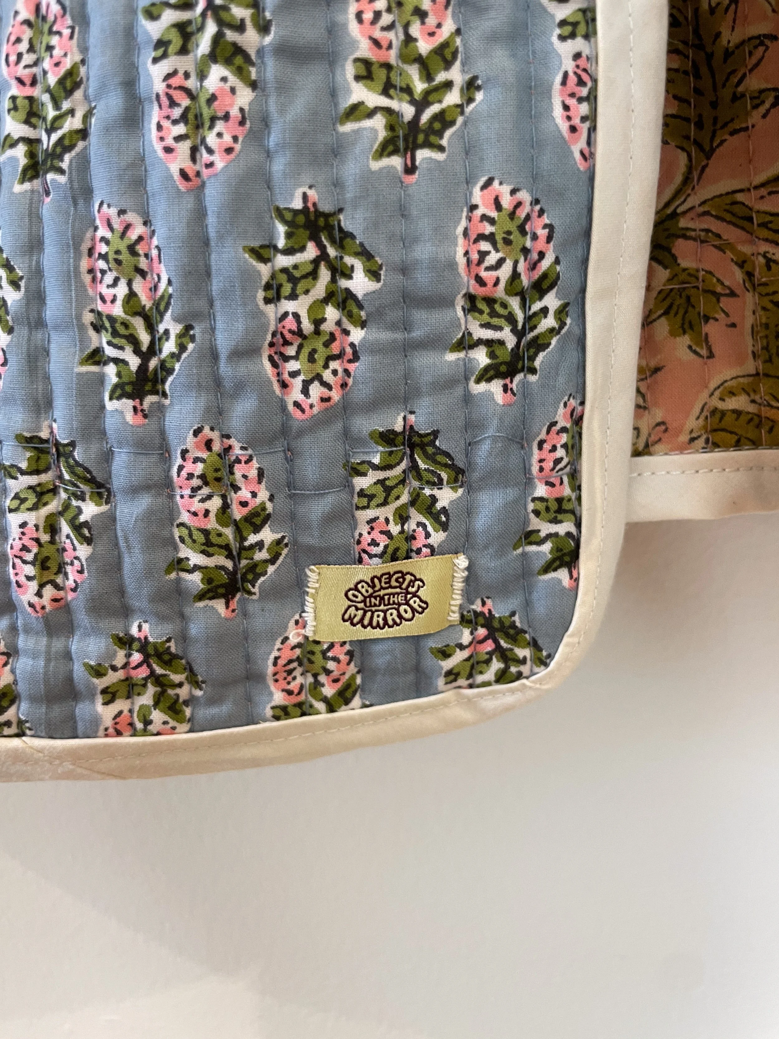 Cut and finished entirely by hand, the vest is made to order in our studio. Layers of Indian hand-blocked and screen-printed cotton are stitched together with natural cotton batting, creating a breathable, lightweight warmth that softens and shapes itself to your body over time.